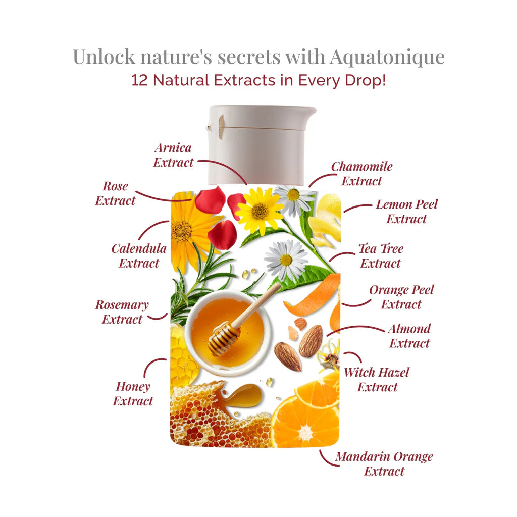 Crafted with gentle yet effective natural ingredients like Tea Tree, Witch Hazel, Rosemary, Chamomile, Honey, Almond, Rose, Lemon Peel, Mandarin orange, Orange peel etc., our micellar water and toner hybrid cleanses without stripping the skin of its natural moisture, leaving it clean, refreshed, and balanced. Suitable for all skin types, including sensitive skin, Aquatonique is a must-have addition to your daily skincare routine. Elevate your regimen and experience the convenience of dual-action cleansing and toning for healthier, more radiant skin.