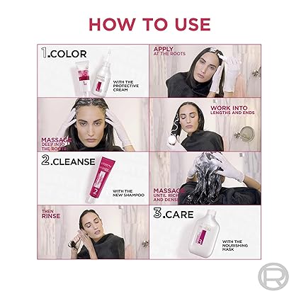 - Read instructions and patch test 48 hours before use: 1.) Use gloves and pour colouring into developer bottle and shake to mix, 2.) Apply colour and leave for recommended time, 3.) Shampoo out and follow with conditioning mask