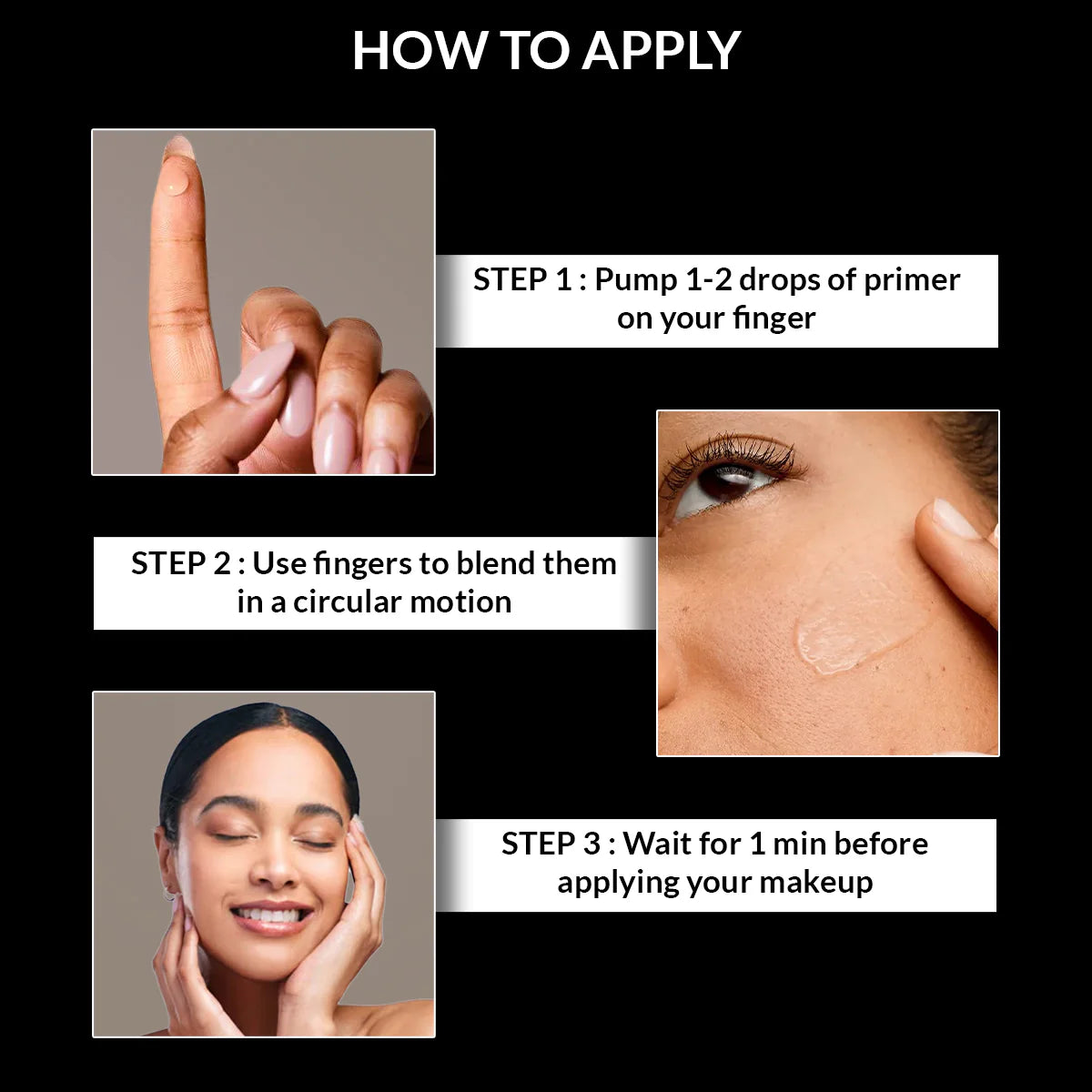 - Hides imperfections, Smoothens pores, Softens appearance of lines